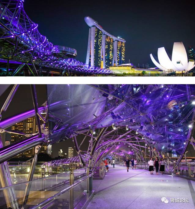 新加坡金沙酒店北侧连接北段海岸的大桥,白天看着并没有太大的亮点,只是螺旋桥的平台是观看鱼尾狮喷泉的最佳位置。一到晚上,灯光亮起,这里绝对是最炫目的景点之一。