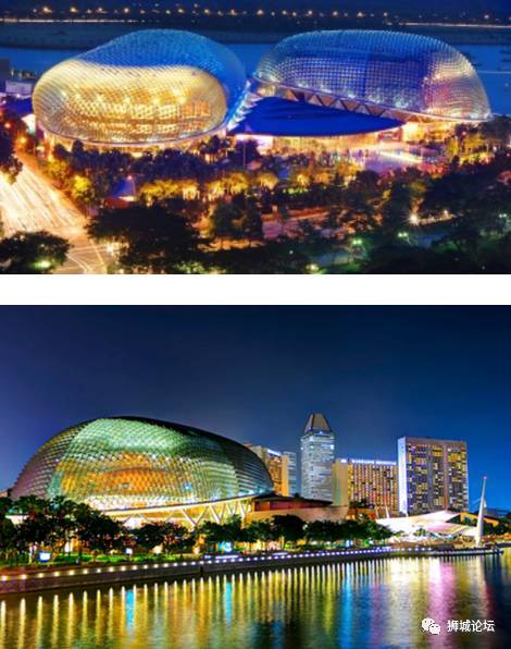 在滨海湾的西北侧,与鱼尾狮喷泉有一座大桥相连。它代表性的大榴梿造型,是它成为这里热门景点的原因。夜晚来临,顺着滨海湾,从鱼尾狮喷泉,经过滨海艺术中心前往金沙酒店一侧,就是最经典的夜景路线。