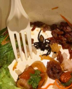 外送食物里出现蜘蛛,本地网民Siew Ping上星期五(11日)将亲身经历上传Facebook, 并贴出照片引发疯传。当事人Siew Ping 表示,她是在星期四(10日)晚上9点30分,通过送餐平台Deliveroo 购买了本地餐馆Aloha Poke的一份三文鱼套餐,并在里面发现蜘蛛。
