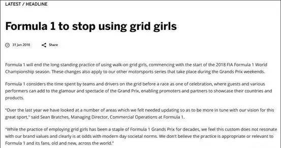 2018年1月31号,F1赛事组织官方宣布,从此以后再无赛车女郎。官方声明说:“赛车女郎这一传统已经脱离时代,也与F1的品牌价值相违背。”