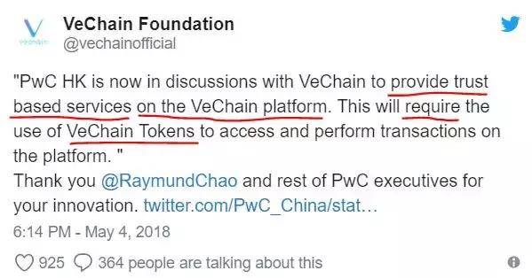 唯链VeChain暗示此举将提高其代币的应用场景(需求)。