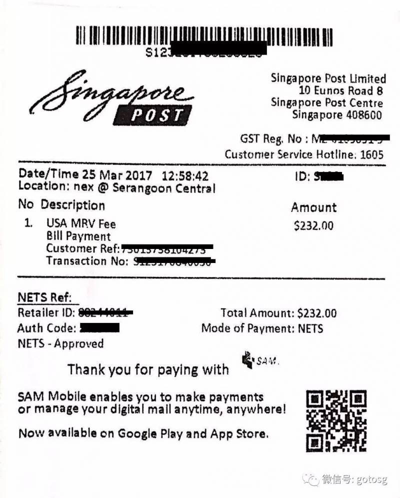 1.去新加坡任一邮局(SingPost)缴费,可用现金或NETS支付,只要跟柜台说你要交美国签证费,并提供Deposit slip就可以了。
