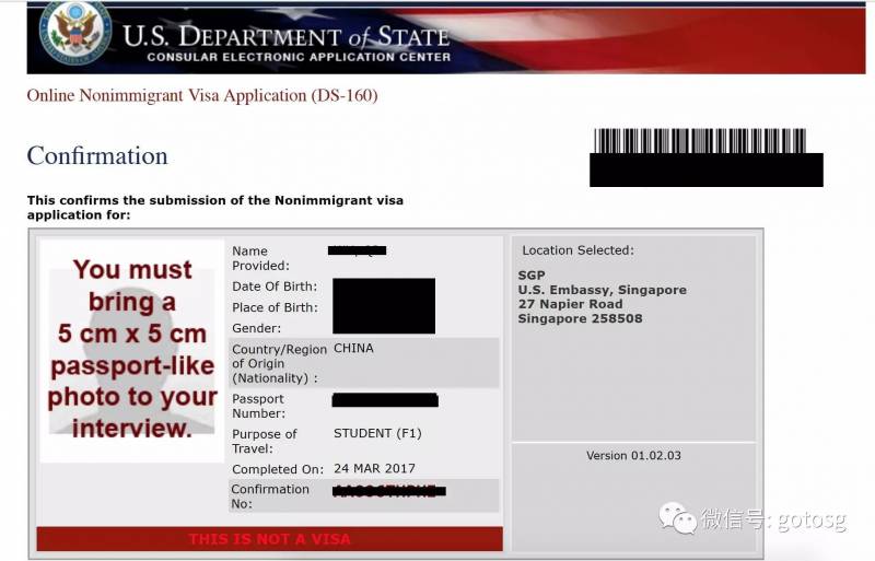 填完DS-160申请表后,系统会自动生成一个确认界面,请记得把这一页打印出来,一同带去面签。