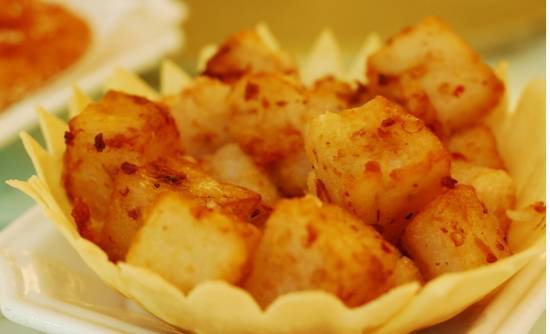 菜头粿,俗称萝卜糕。菜头粿原来是广东潮汕地区的一种年糕。最早是将萝卜去皮刨丝,再加入腊肠粒、虾米粒、香菇粒、芹菜粒等配料蒸制而成,外酥内嫩,味道清香而不甜腻。
