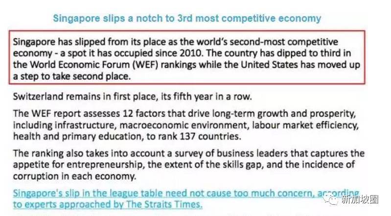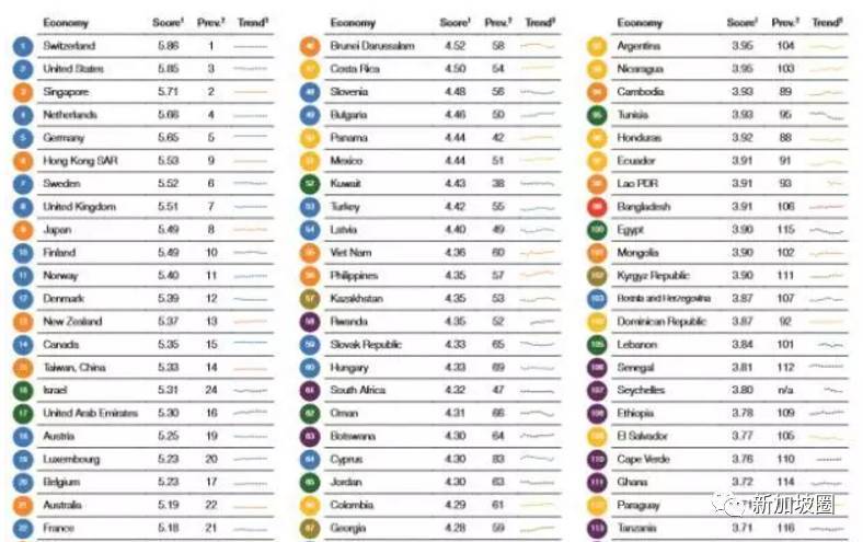 而新加坡则从第二降至第三,属于退步阶层。不过,在各领域表现仍非常优异,尤其是公共部门的表现还被评为全球最佳。 世界经济论坛认为新加坡在创新能力和商业成熟性这两个领域还需提升,只在这两个领域排名第9和第18位。显示尽管政府已加大推广力度,但仍不足以追上全球一些最具创造力的经济体。尽管如此,报告指出新加坡的交通基础设施,产品与劳动力市场以及金融领域都维持非常高的效率。