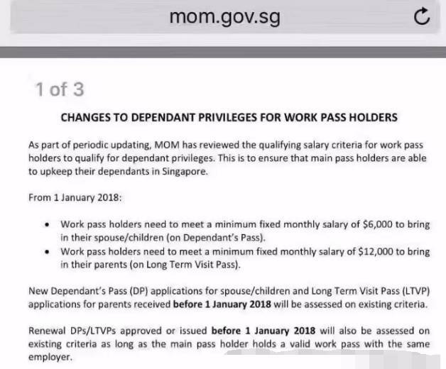 工作准证持有者需要符合最低工资标准,才能为其父母申请家属准证,最低工资12000新元。