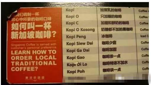 别以为靠中文走新加坡可以一点无压力,想要在早餐店点一杯咖啡,看到满招牌那些“Kopi-O”、“Kopi-C”、“Teh-C”的,估计你就傻眼了。