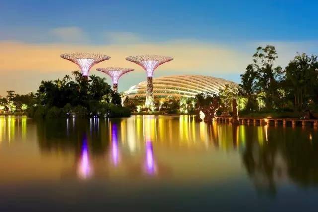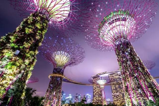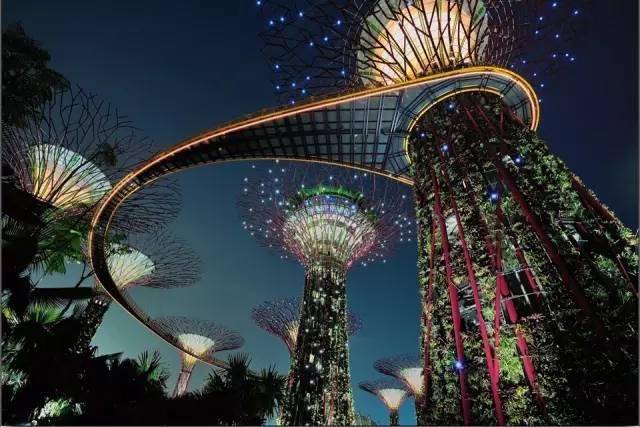 这里的夜明亮而透彻,这里的空气清新而凉爽。滨海湾花园里竖立18棵高50米的擎天大树,造型怪异,每棵树的外墙都种满植物,可调节温度,除了遮阳之外,还拥有灌溉和照明功能。到了晚上犹如阿凡达的精灵树散发出神秘幽兰的光芒。
