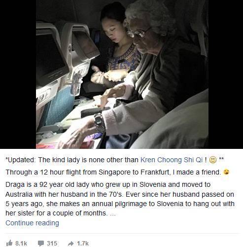 在新加坡飞往法兰克福的12小时新航航班上,网友Shazy Tan认识了92岁独自乘飞机的Draga女士。“Draga70年代随着丈夫搬到澳大利亚。她的丈夫在5年前去世,因此,她每年都会独自飞到斯洛文尼亚,与姐妹相处几个月。”