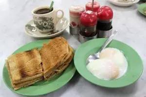 咖椰吐司和生熟蛋当属新加坡式的传统早餐,它能和拉茶(甜味奶茶)、好立克和热美禄等很多饮料搭配。传统制作的面包是旧时长方形白面包,切面抹上咖椰(是用鸡蛋、糖、椰浆以及香兰香料制作而成的一种调味酱),然后烤制而成。