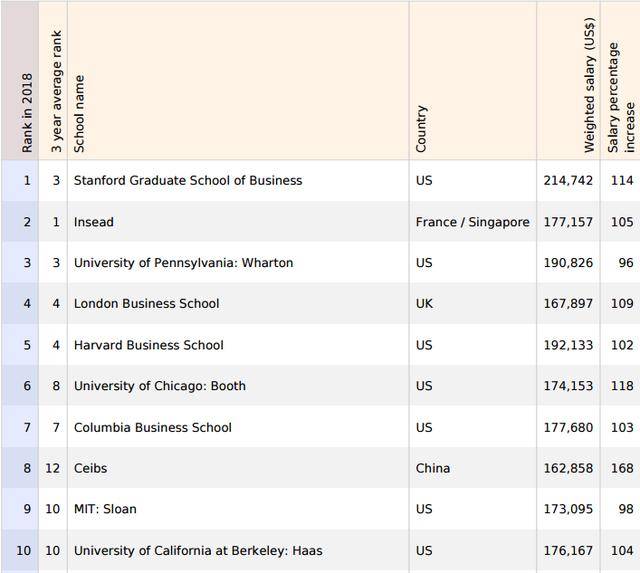 MBA院校前十名,美国高校占据7席,分别是史丹福大学商学院、沃顿商学院、哈佛大学商学院、芝加哥大学商学院、哥伦比亚大学商学院、麻省理工以及加州大学伯克利;