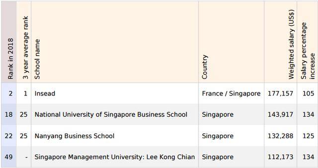 上榜且排名前50的新加坡MBA高校