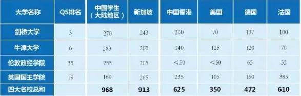 很多国外大学在招收中国学生的时候,其录取标准比较严格。在选择国外大学时,往往会受到招生数量和升学政策上的限制。这张表格是2016-2017 年英国几大顶级名校分别在中国、新加坡、美国等国家和地区录取的学生人数情况。