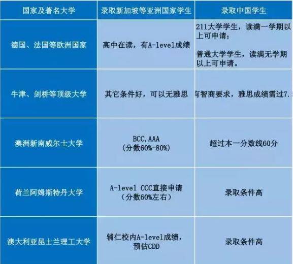 在报考政策方面,许多国家的著名大学在新加坡的招生标准要远远低于在中国的招生标准。比如牛津、剑桥这样的顶尖大学,对新加坡的招生标准是“其他条件好,可以无雅思”,而录取中国学生的标准则是“有智商要求,雅思成绩需过7.5”。为什么会有如此大的差距?