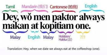 独具特色的Singlish,在以英语为主体的基础之上,融合Hokkien(福建方言),Cantonese(粤语),Hakka(客家话),Malayu(马来语)和Tamil(淡米尔语)等众多语言。