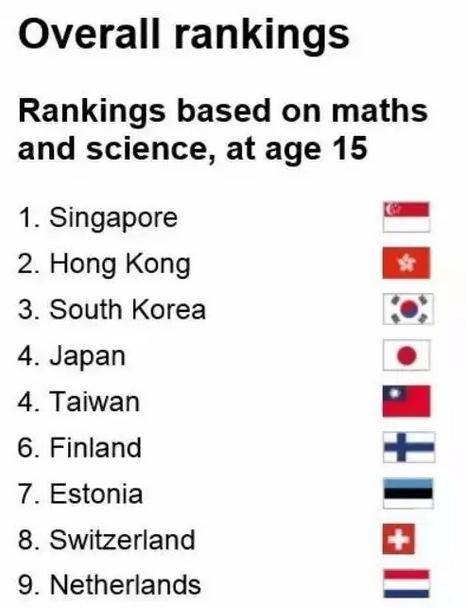 该排名主要依据76个国家的15岁学生在阅读、算数和科普技能等方面的测试成绩统计而成;