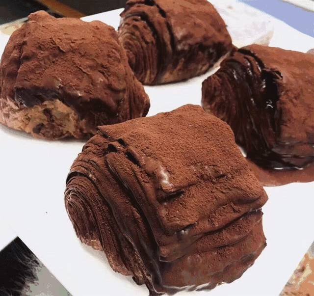 浓郁的巧克力酱包裹着超软的起酥面包,外面再撒上一层厚厚的巧克力粉......万事通的口水都要滴在键盘上了。