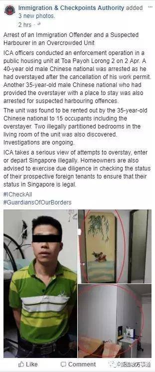 今天移民与关卡局(ICA)发文称,在本周一(4月2日)早晨6点左右,移民与关卡局突击检查大巴窑2巷一带的组屋,结果在一间三房式组屋单位中,竟然发现一名40岁的中国籍男子工作准证已经被取消了,还非法滞留在新加坡!当局当即逮捕了他,同时逮捕的还有窝藏逾期居留者的35岁中国籍男子!