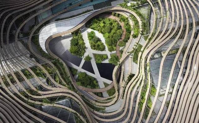 它拥有大面积的绿化、绿色的墙壁、水景和高阶的露台花园,在一个全是传统办公建筑的区域里,显得格外引人注目。