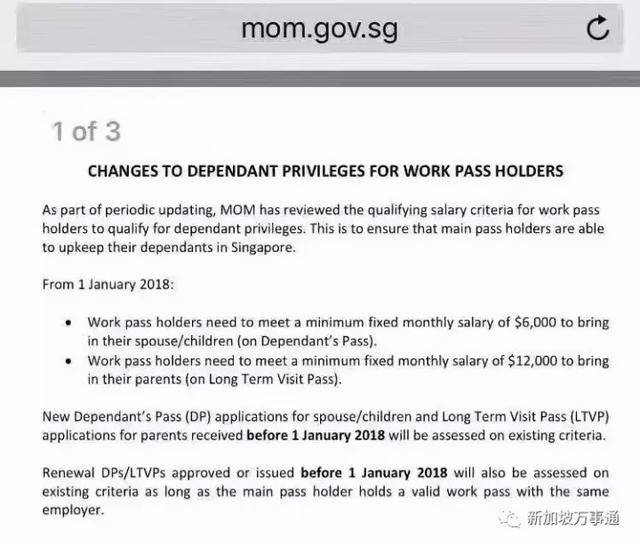 接着,从2018年1月开始,EP给家人申请DP和LTVP要求的最低薪水也提高了,带配偶和孩子最低薪水从每月5000新元上涨到了6000新元;带父母最低薪水从每月10000新元上涨到了12000新元(详情:新加坡家属准证(DP)和长期探访准证(LTVP)政策大调整,全面解析!);