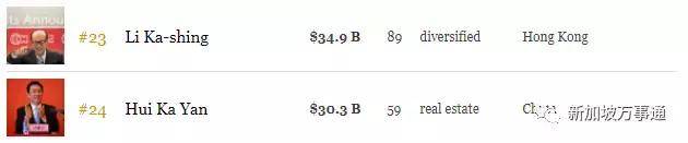 并列第四名的分别为香港鸿基地产的李兆基和恒大集团的许家印,都以303亿美元的身家在全球富豪榜上并列第24名。