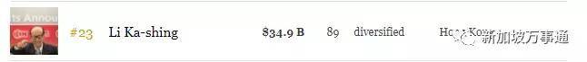 排名第3的就是长江实业董事长李嘉诚了,他以349亿美元的身家在全球排名第23。