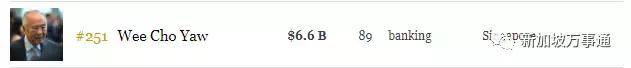大华银行UOB荣誉主席——黄祖耀今年晋升一位,在新加坡排名第3,身家是66亿美元,在全球排行榜上是第251名,一下子跃进了73名!