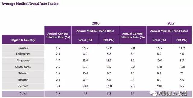 A. 新加坡的医疗费用每年上涨迅猛,根据2017 Aon Global Medical Trend Rates 的报道新加坡的2017年总医疗通货膨胀率为15%,同时期工资的升幅为2.7%。