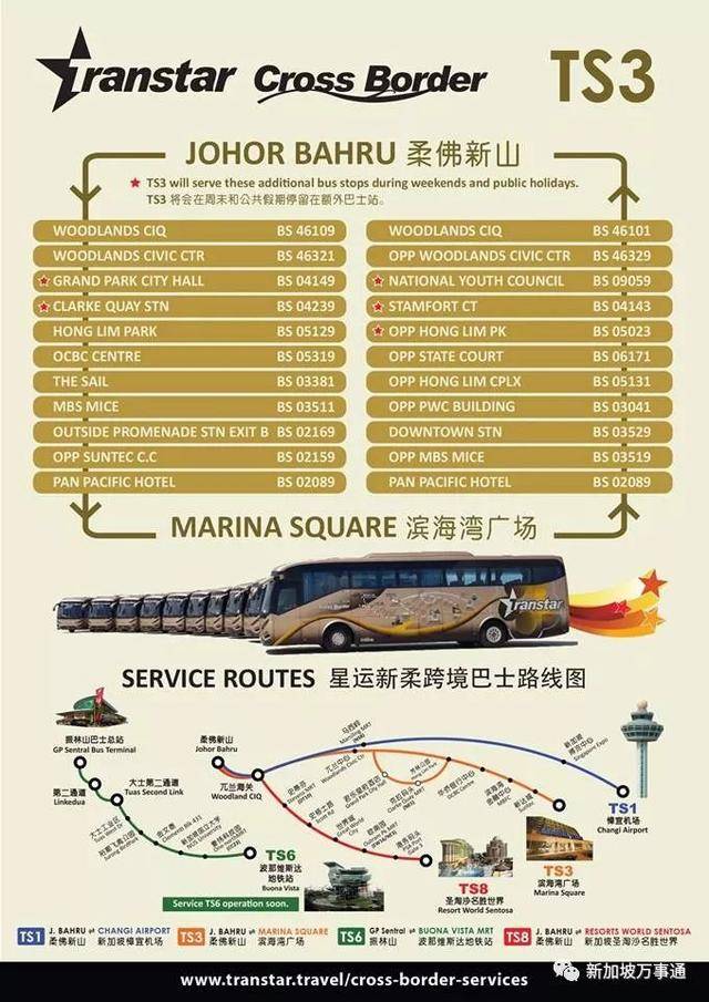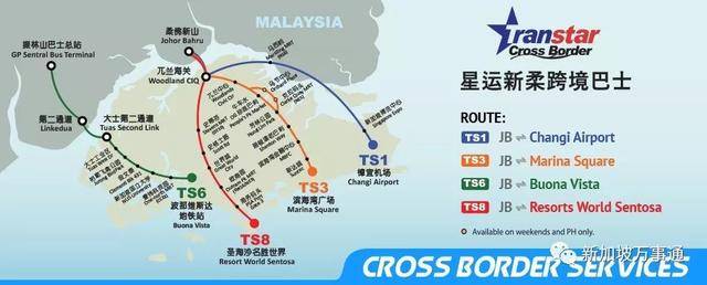 跨境巴士公司星运公司推出的这项新服务线路---TS3,该巴士路线将从清晨6点开始,每小时从柔佛新山开往新加坡滨海湾广场,途中经过芳林公园,牛车水,老巴刹,滨海花园,新达城等。乘客可以在沿路指定的巴士站上下车。从滨海湾广场开往柔佛新山的最后一班车为半夜12点。