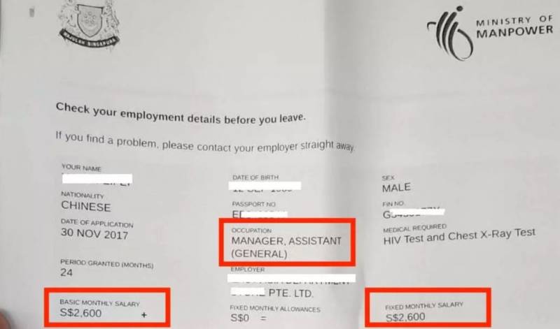 根据张先生所拿到的SP准证批文,他的薪水为2600新元,而且职位为经理助理,并非收银员。