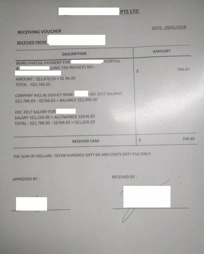 公司是1月5日开工资,给现金。因为当时我身体不舒服,还在病假中,所以没有去拿工资。到了1月8日,老板打电话让我去趟公司,老板说我生病是因为自己的原因,并不是在工作中断了手脚,所以2700多新元的医药费要自己还,而且将工资先扣了700多块。