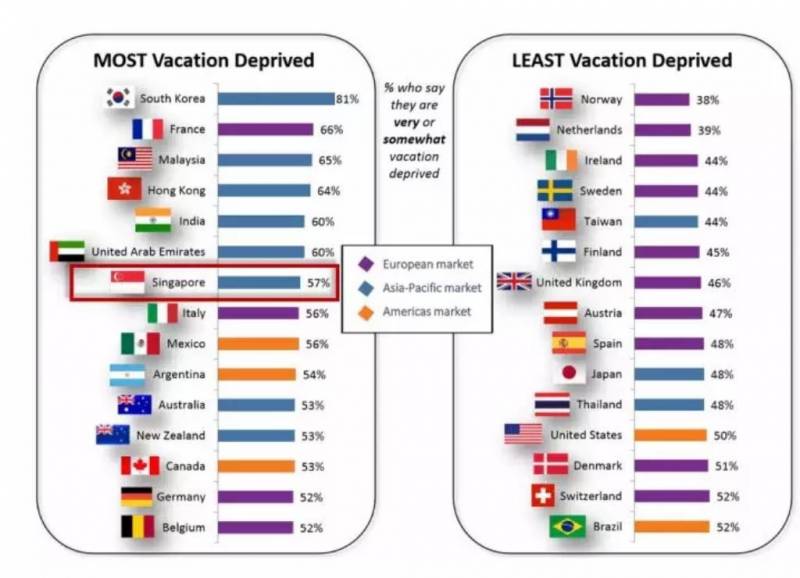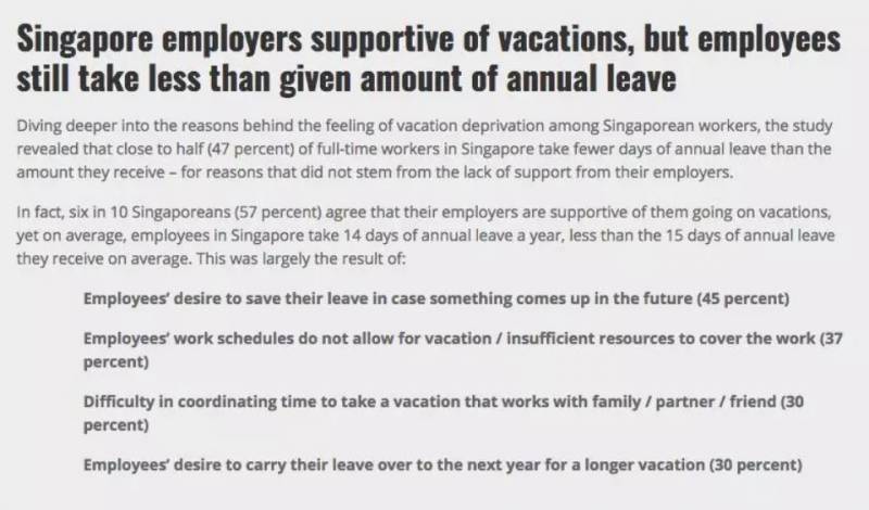 对于这个,他们也表示很无奈啊。一方面公司很支持员工休假,但事实上,新加坡每年平均年假有15天,但57%的人表示其实只休了14天。