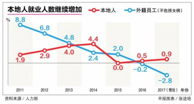 根据人力部在(1月26日)发布的2017年劳动市场预估报告,就业总人数(不包括女佣,下同)去年预计减少1万零700人或0.3%,是自2003年以来首次减少。