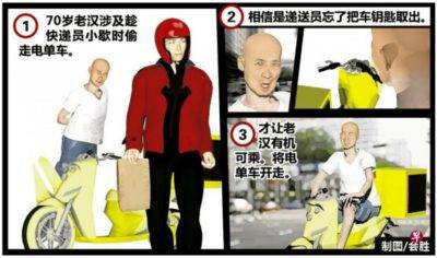 据说因为当时递送员没有拔钥匙,才让老汉有了机会!