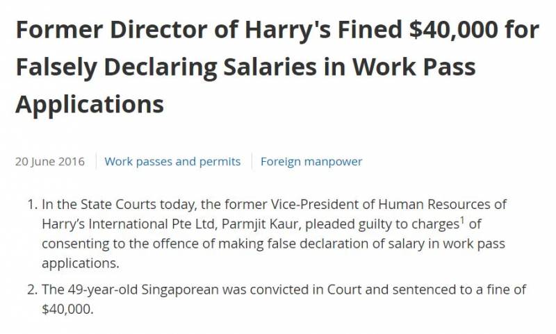 新加坡的法律是很严的!千万不要随便尝试。之前人力部发布公告,一家名为Harry’s International的公司,其董事在为公司员工申请工作准证的过程中,涉嫌谎报工资给人力部,最终被判罚款40000新币。