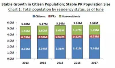 根据新加坡2017年人口简报,新加坡总人口数是561万,其中公民有344万人(蓝色),永久居民有53万人(红色),非居民有165万人(绿色)。
