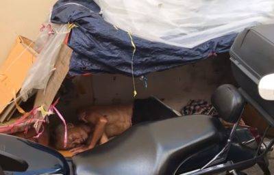 事后记者在(12日)傍晚实际走访该处时,尽管下着倾盆大雨,Pang也依然熟睡着。为了避免自己的黑色塑胶鞋被雨淋湿,他就将鞋子放置在白色大木板的旁边。