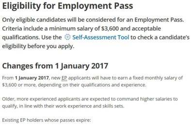 Tips:目前MOM的EP薪水要求是3600新币,但是和工作年龄、学历、毕业院校都有关系