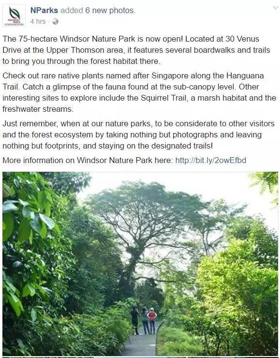 就在前段时间万事通给大家推送了一条:“新加坡最大的自然公园开放了,周末新去处”的时候,前几天新加坡国家公园又在官方Facebook又宣布:新加坡第六个自然公园,温莎自然公园正式开!放!啦!小伙伴们周末又有新去处撒欢啦!