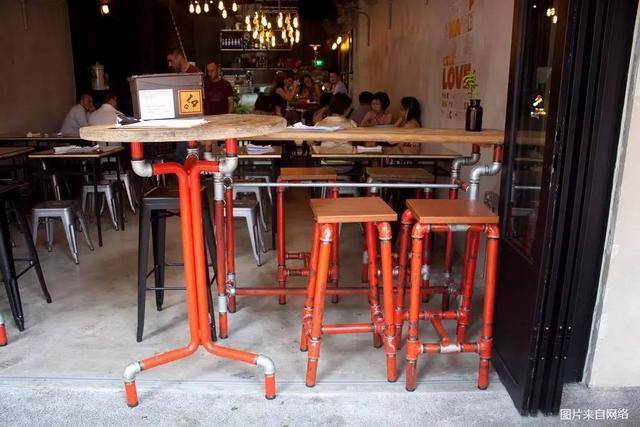 店里面也有很多旧时光的印记,比如已经斑驳的中药柜子和悬挂在墙壁上的老式电风扇。桌椅则是用刷了红漆的铁管改造而成,是不是挺有创意的?