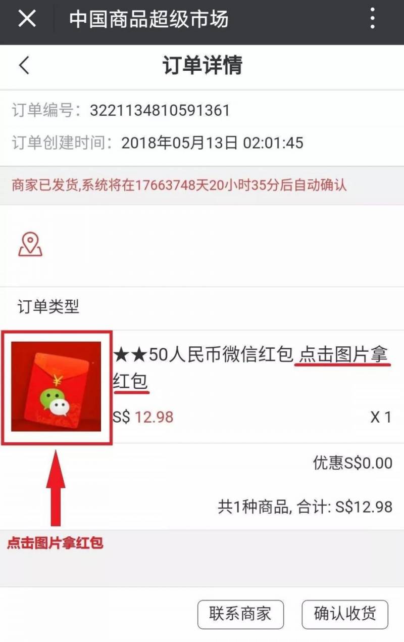 第四,然后你就可以到【我的订单】中查看,订单中会出现一个收款的“红包”图片,请点开图片拿红包↓↓