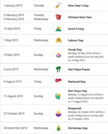 新加坡人力部公布了2019年的11天公共假日,有五个假日在星期五或星期日。明年可享有五个长周末。