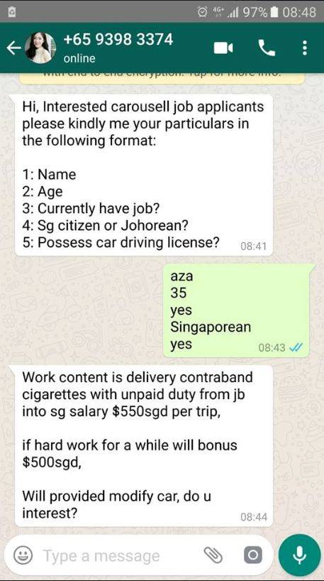 一名网友在买卖市场应用程序Carousell上找工作,联系到了一位“雇主”。在网友回答完所有个人信息问题后,“雇主”便开始解释:这份工作就是将违禁香烟从马来西亚新山带进新加坡,每一趟能够赚得$550新币,工作一段时间后,还会拿到$500新币的奖金。这份工作还能提供改装车。