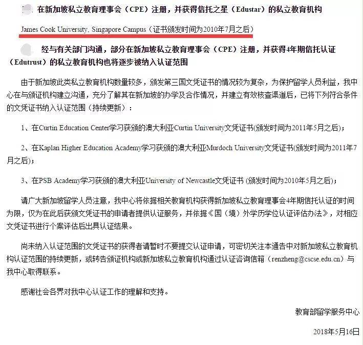 上图是由教育部留学服务中心发布的《关于新加坡私立教育机构认证范围的公告》的截图(原公告网址请点击截图图片),其中“James Cook University, Singapore