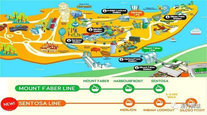 圣淘沙的缆车一共有两条线:花柏山景线和圣淘沙线。进圣淘沙是坐花柏山景线,有三个站,分别是花柏山景、港湾和圣淘沙站。进岛可以到花柏山顶的花柏山景站和港湾城的港湾站乘坐。