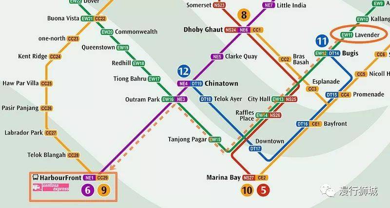 乘坐地铁紫色线1号站或者黄色线最后的一站Harbourfront站(黄色的方框)下车。