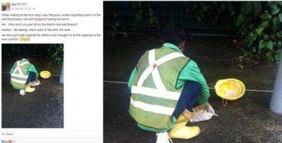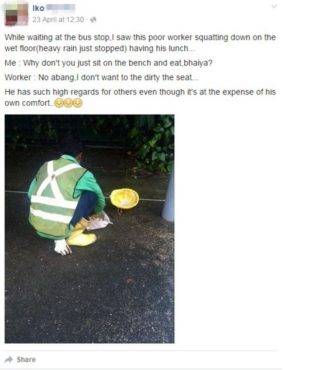 据了解,该名孟加拉籍外劳在一家绿化公司负责除草的工作。 po文者表示看到外劳蹲著吃饭觉得好奇,于是就上前问个原因,才知道原来他是不想把椅子弄脏。他希望借由这个帖让人们不要带有色眼光看待外劳们,他们也算是为建设国家付出辛苦的劳力。