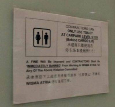 就在同一天,新加坡乌节路的一间商场竟然在男厕门口张贴告示,只允许建筑工人使用指定的厕所,违例者将被罚款和禁止在商场内工作。