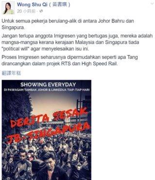 该照片是由前方等待通关的马劳,往后随手拍关卡摩哆拥堵情况而成;照片中男主角的无奈神情,却引起网民热议,连民主行动党士乃区州议员黄书琪也在面子书转载此照