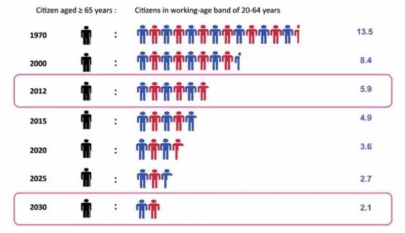 数据如下,如果新加坡人再不努力造人,那么到了2030年,新加坡将只有2个年轻人赚钱来支撑1个65岁以上的老人!如果新加坡的老人不工作一样在家享清福,那么新加坡的压力会无比巨大!